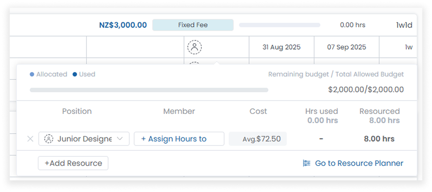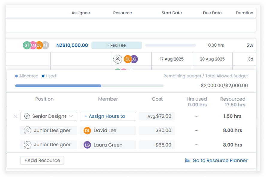 Assigning by position also provides an estimated project cost, calculated using the average rate of the team members within that role, giving you greater clarity in planning and budgeting.